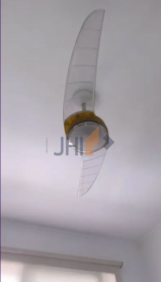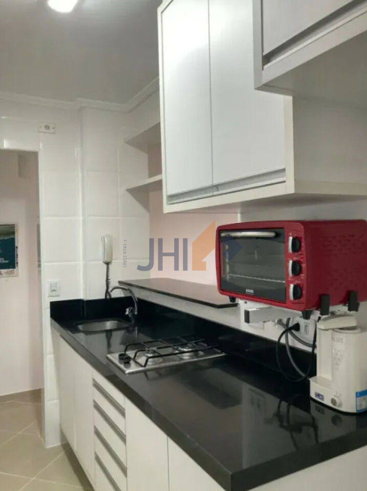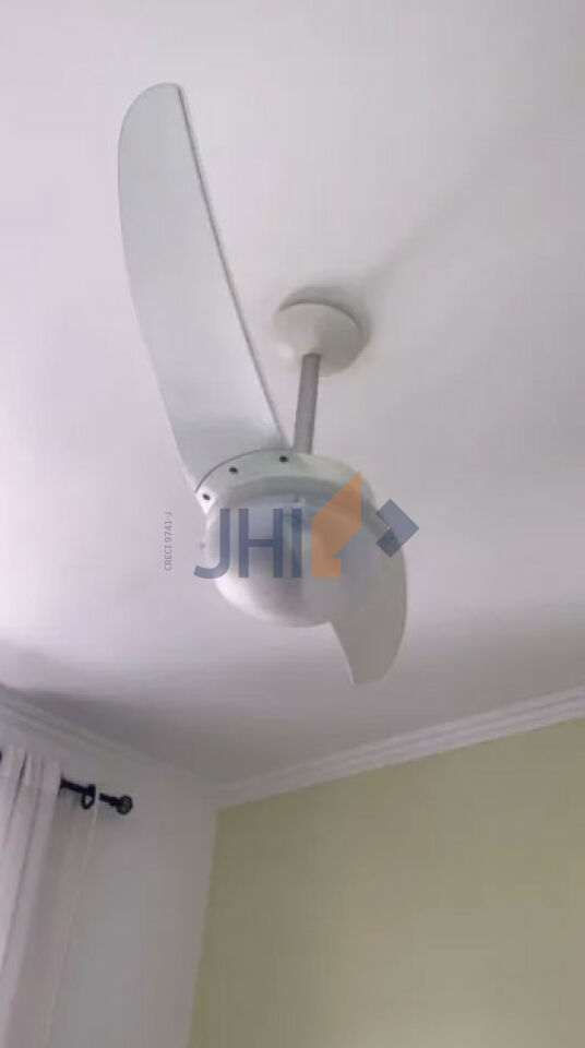 Com uma sala com ventilador de teto, um dormitório com armário e ventilador de teto, cozinha americana com armários planejados, pia em granito preto, cooktop com duas bocas, forno, área de serviços separada por porta sanfonada, banheiro moderno, com box, espelho, gabinete.