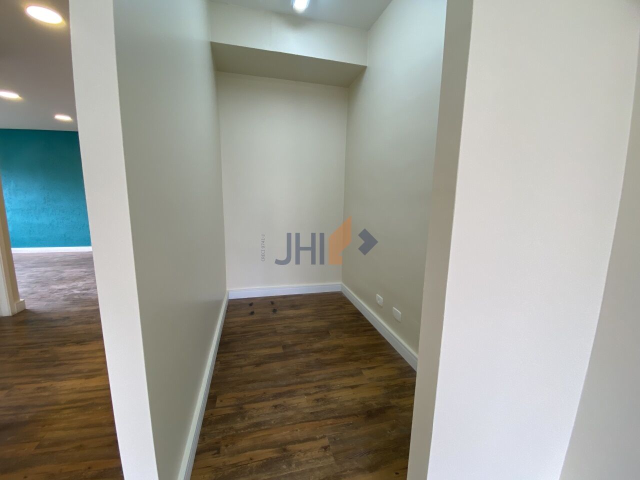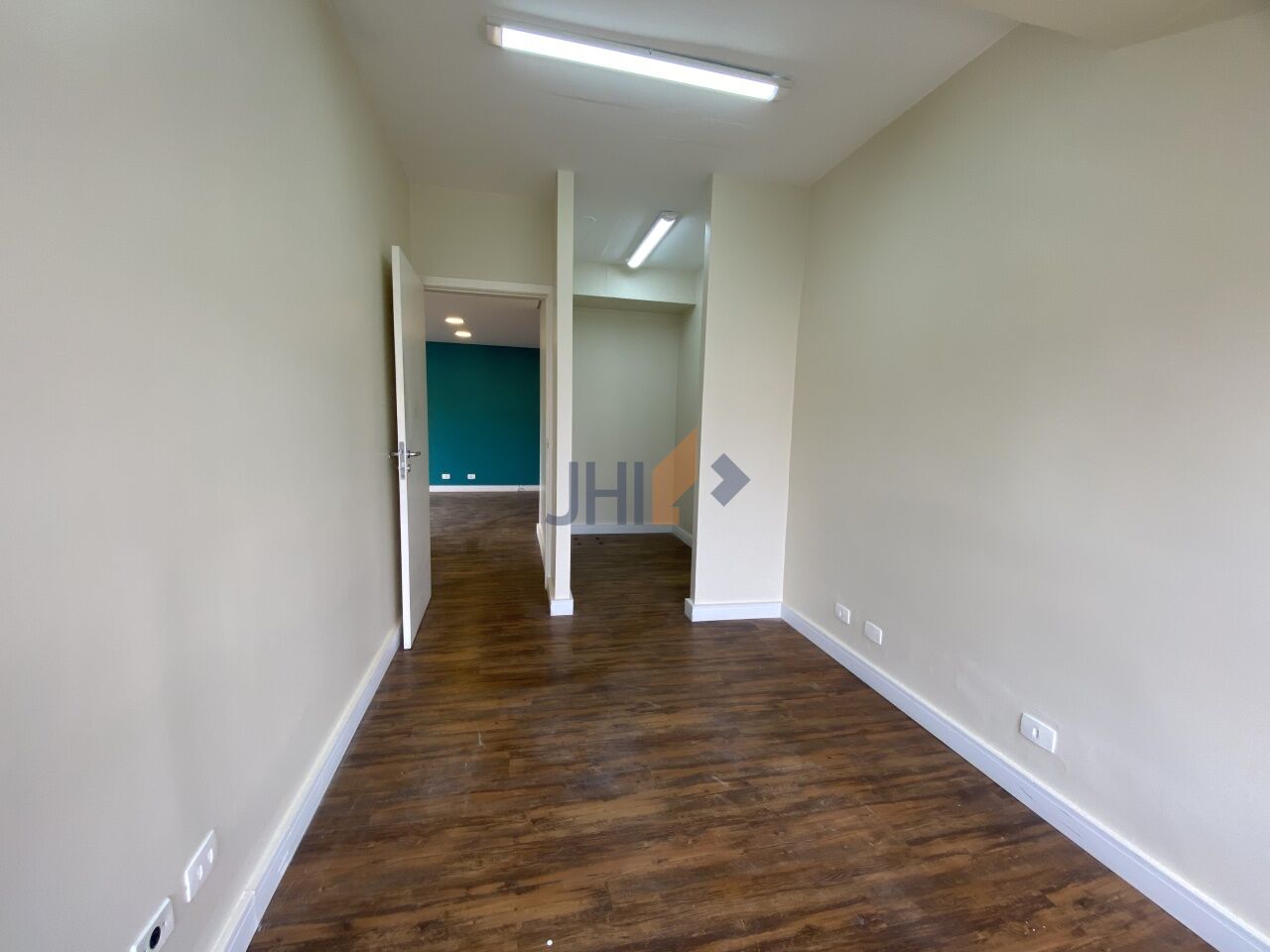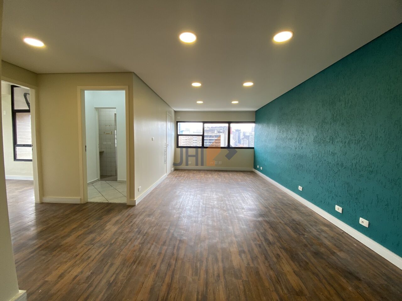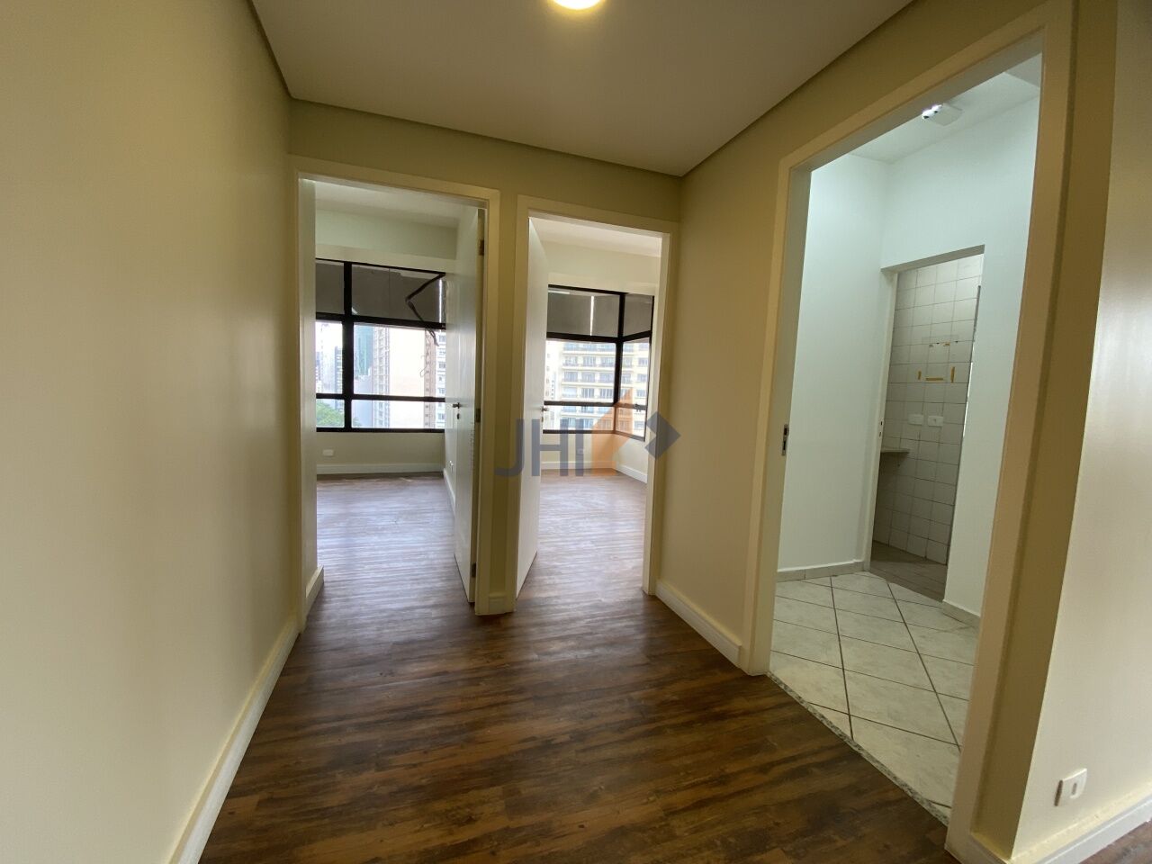 Conjunto comercial para locação com 65m², 1 vaga de garagem, 2 banheiros, 1 copa e 1 sala grande com divisórias, portas para recepção e dois amplos consultórios/escritórios.