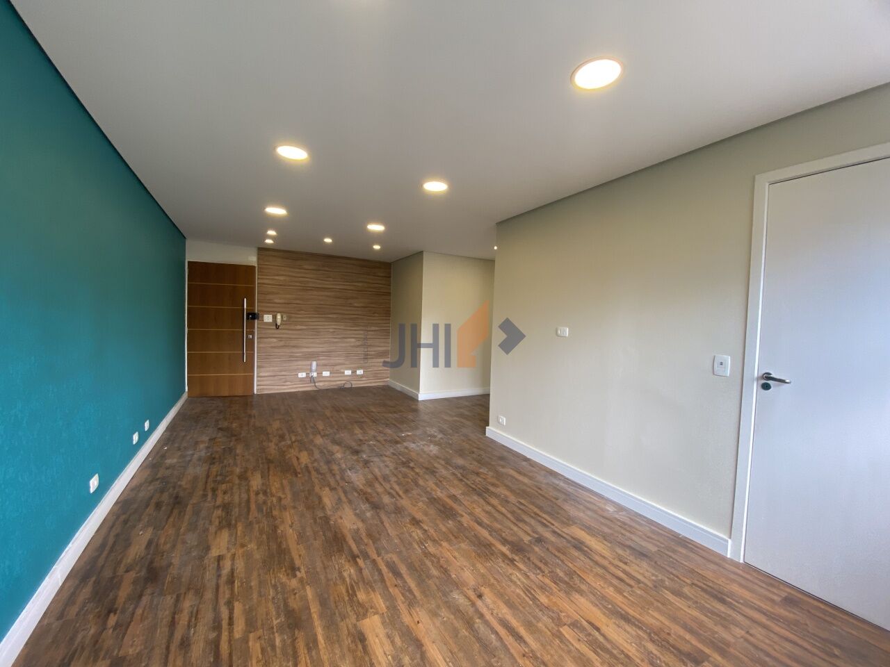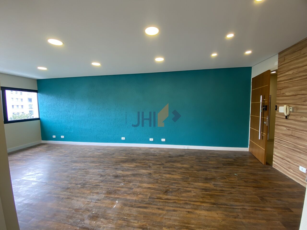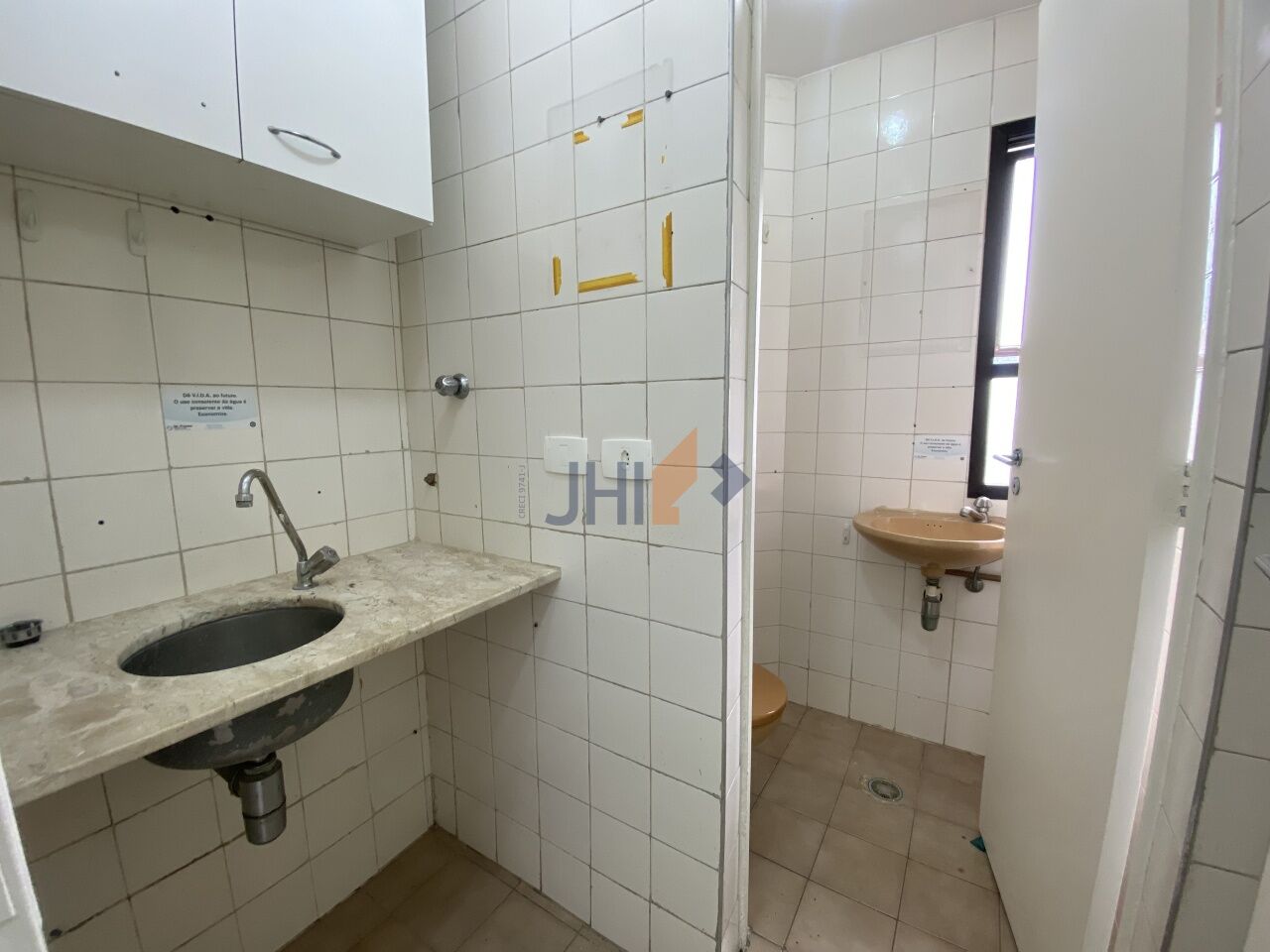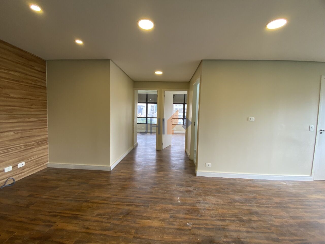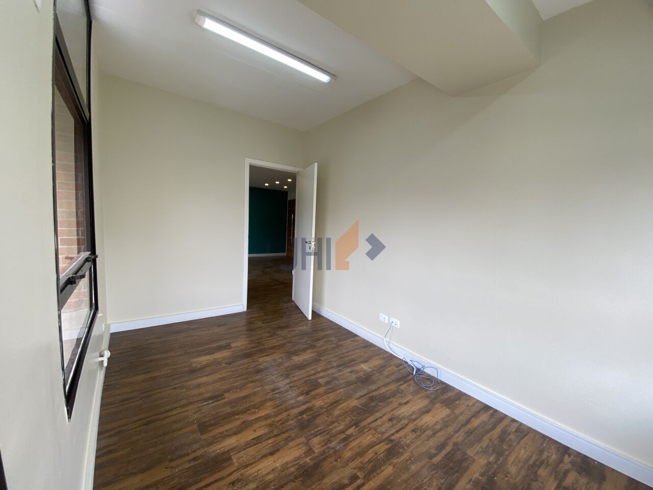 Conjunto comercial para locação com 65m², 1 vaga de garagem, 2 banheiros, 1 copa e 1 sala grande com divisórias, portas para recepção e dois amplos consultórios/escritórios.