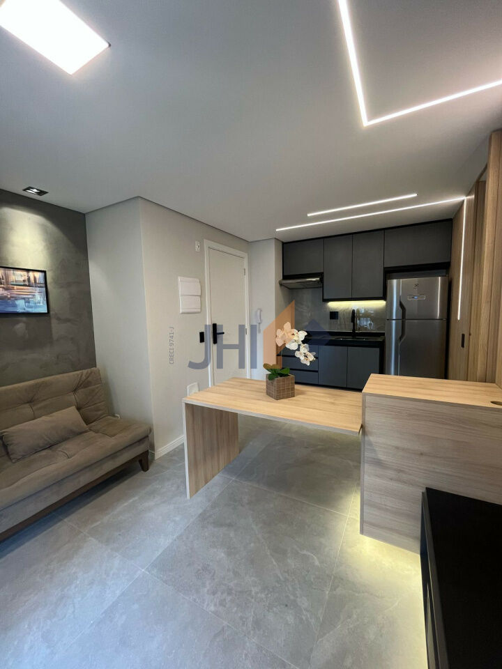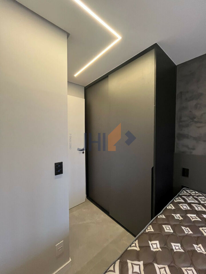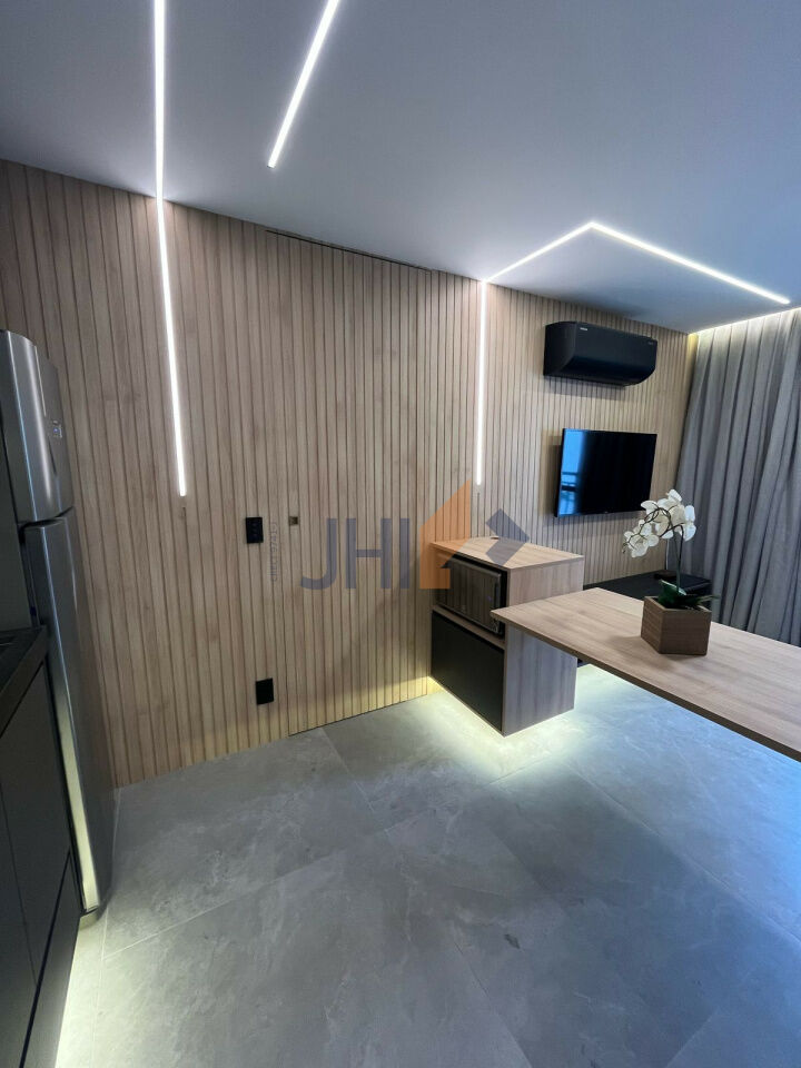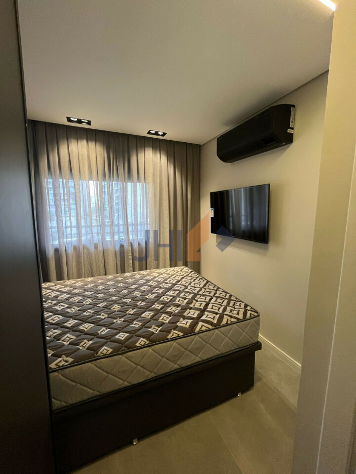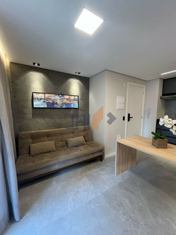 Sofisticação, praticidade e bom gosto. Lindo apartamento com sacada, totalmente mobiliado e decorado, prontinho para morar! Piso em porcelanato e gesso com projeto de iluminação em todo o imóvel, marcenaria de primeira linha, equipado com aparelhos de ar-condicionado e de TV no quarto e na sala, geladeira, cooktop, depurador de ar e micro-ondas. Cama box casal e sofá-cama na sala; mesa de jantar e cadeiras, com bancada de trabalho, persianas na sala e no quarto. Apartamento automatizado, com fechadura digital e controle de iluminação, temperatura e televisão via Alexa ou celular. Sem vaga (estacionamento disponível bem na frente do prédio)