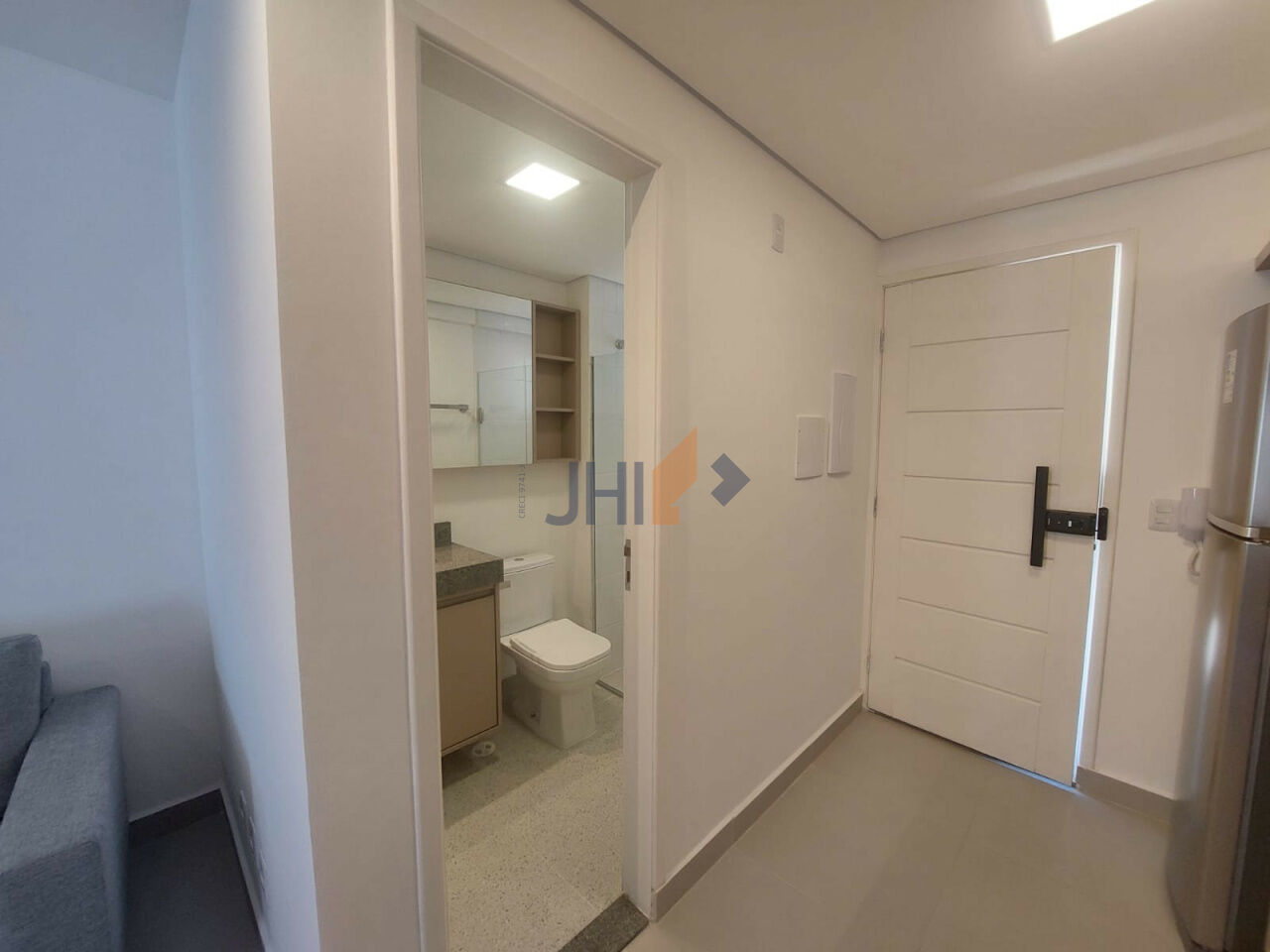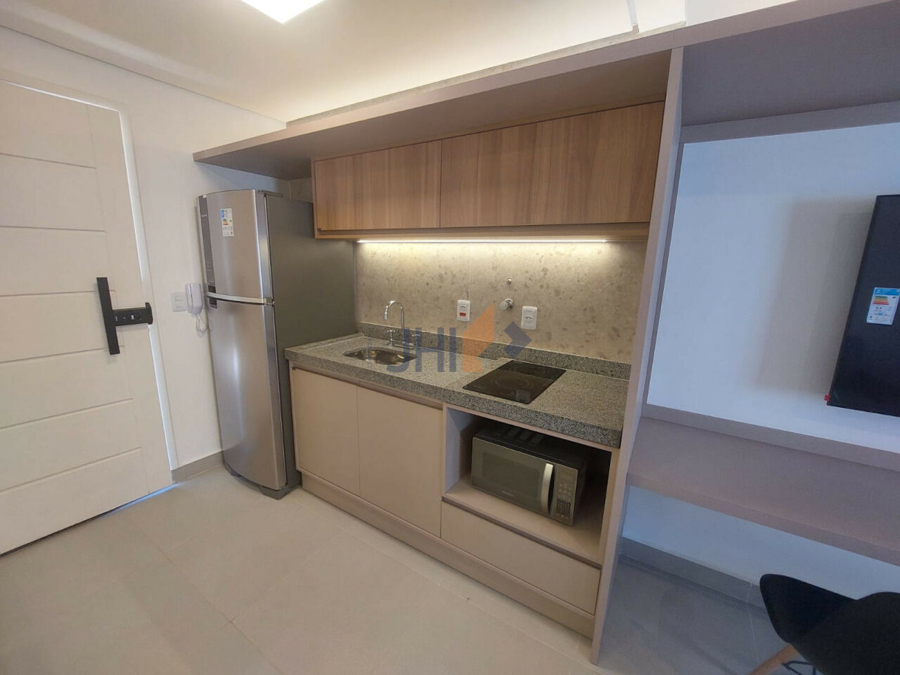 A cozinha é prática e moderna, com armários planejados, fogão cooktop, micro-ondas e geladeira. O banheiro dispõe de box de vidro, armários e aquecimento central, garantindo água quente tanto na cozinha quanto no chuveiro.